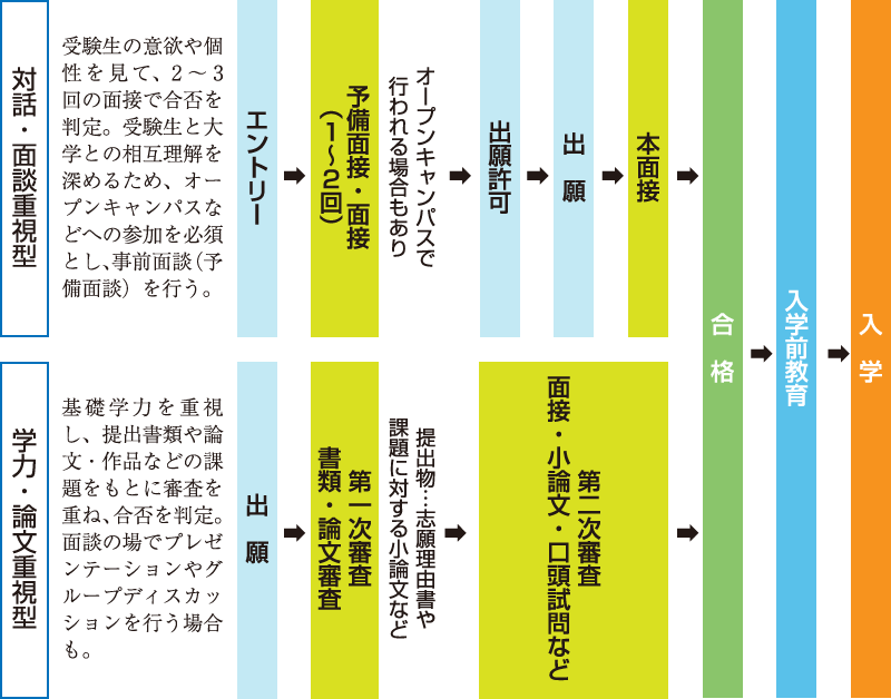 - ●面接や面談、レポートなど大学によって独自の選考方法がある。