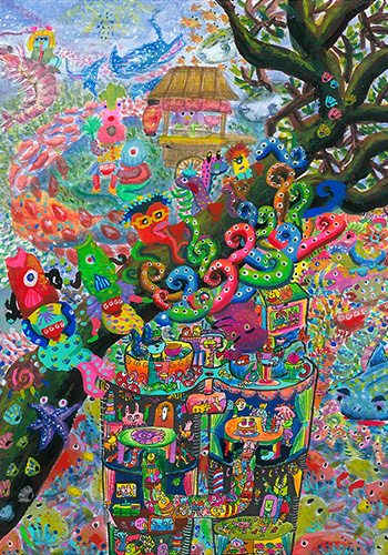 ご飯を食べて、おいしいと思うときや、人がおいしそうに食べている姿を見ている時が、私の「いいね!」と思う瞬間なので、それを絵にしました。