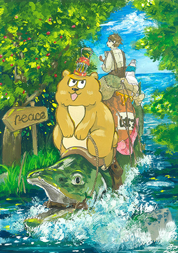 私の生んだ大好きなヒグマくんが、仲間たちと鮭に乗って川を渡っているところです。