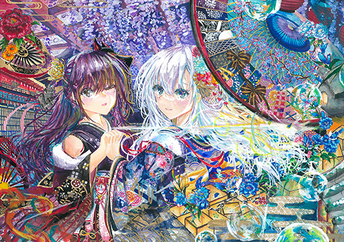 宵祭が明け、本祭りの日の朝日が差し込む中で、二人の女性(推し)が仲睦しくしている優美な和の表現を描いた。