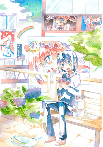 この世界で今大人気な女の子キャラを推している男の子が、登校前に朝早くから買いに走ってブロマイドをゲット。でも夢中になりすぎて、時間はもう学校にまにあわない時間になっているのに気づいていない。